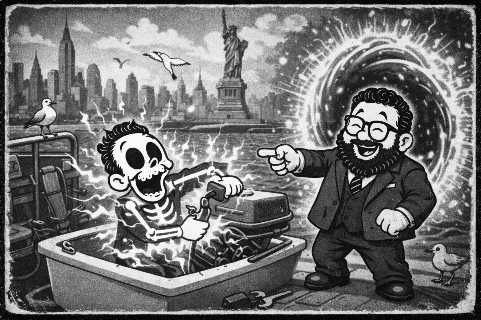 Anthony and Rob are killing time in the NYC harbor, polishing up Anthony’s boat with AB donations and enjoying a rare calm afternoon. While tinkering with a stubborn electrical fix, Anthony trips over a loose cable, sending a spectacular jolt through the boat……straight into reality itself. In a flash of sparks and bad luck, a portal opens and dumps both men into a prehistoric world that makes “rough day on the water” feel like an understatement.