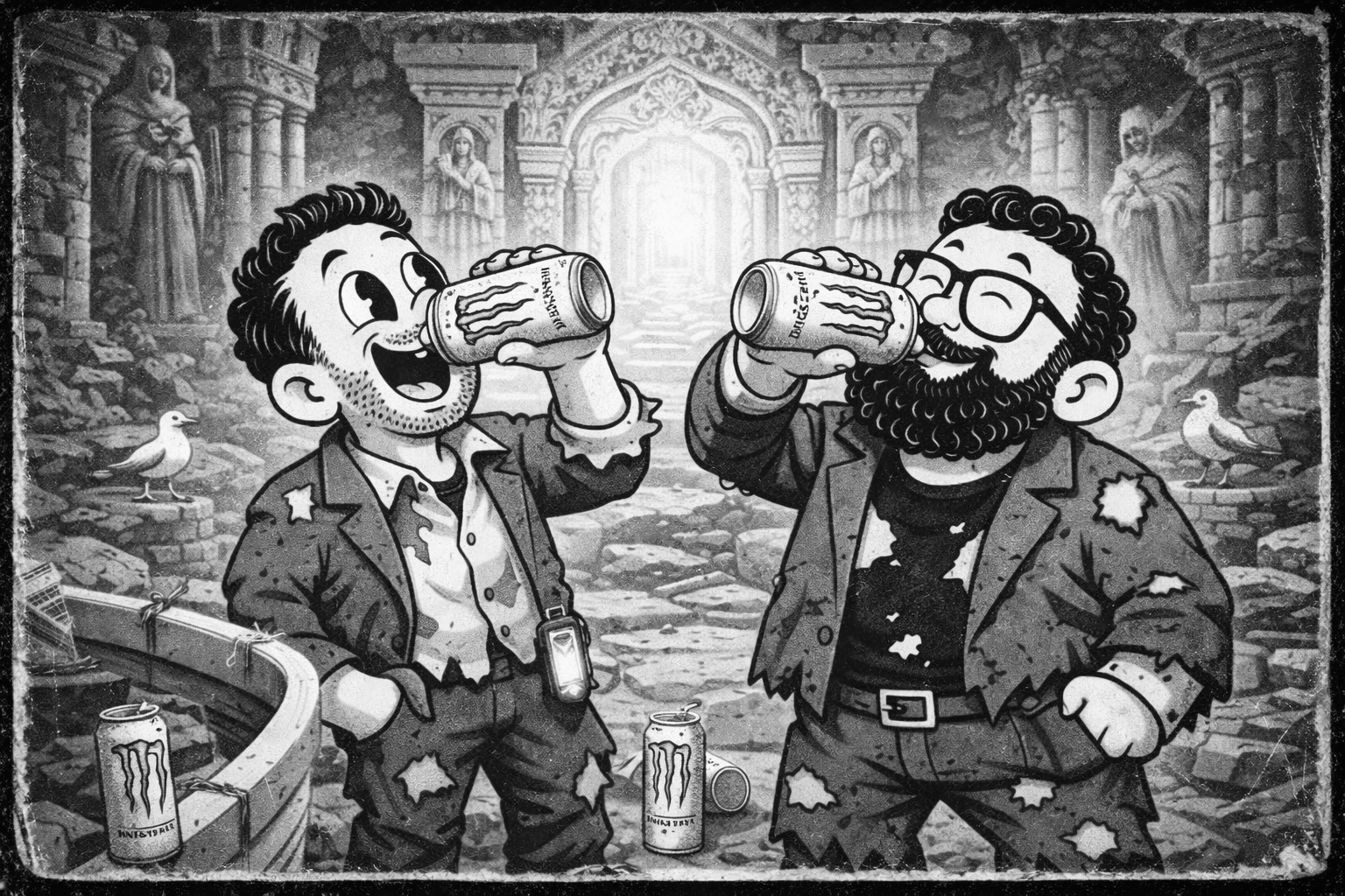Stranded among colossal creatures like Koi and impossible landscapes, Anthony remains gleefully curious while Rob stays skeptical, armed, and increasingly unimpressed. Their situation takes a stranger turn when they encounter a mysterious white monster drink—ancient, intelligent, and oddly discerning. Rather than attacking, the drink tests them, revealing that it is a living key tied to the long-sealed Gates of Agartha.